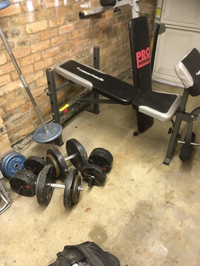 Weight Bench Sit Up Bench And Various Weights And Bars In